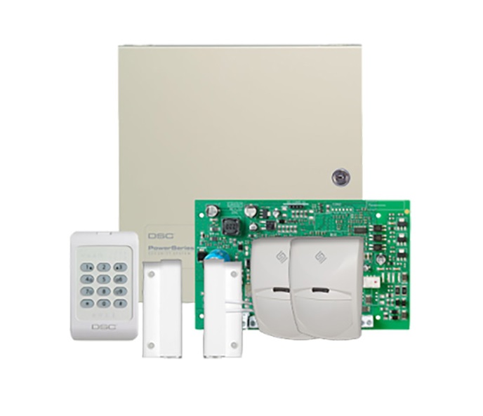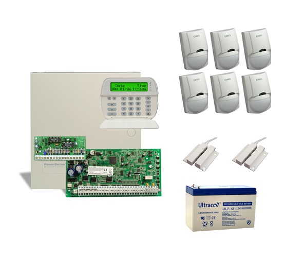 DSC vezetékes lakásriasztó csomag, 6 db mozgásérzékelővel, 2 db nyitásérzékelővel, 1 db kezelővel.