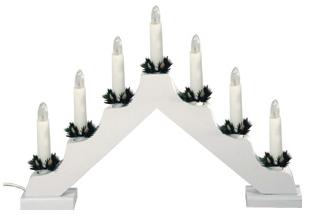 7 db kúpos izzóval világító fehér fatalpas gyertya-piramis, zsinórközi kapcsolóval.