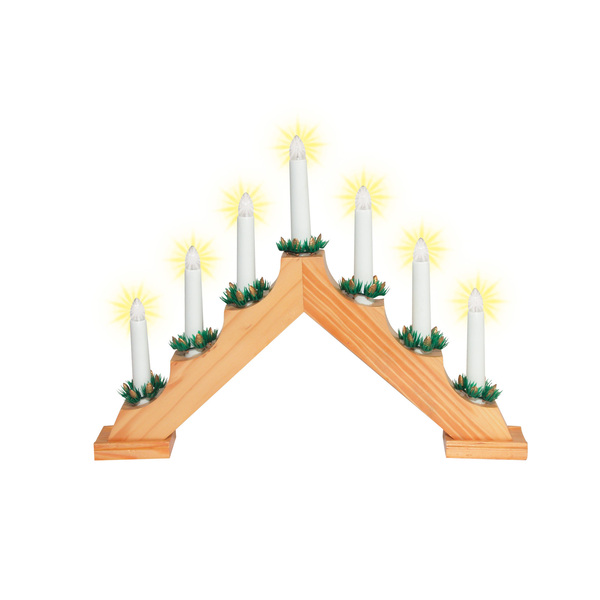 7 db kúpos izzóval világító lakkozott fatalpas gyertya-piramis, zsinórközi kapcsolóval.