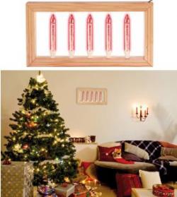 Az 5 db gyertya formájú izzósorból álló, lakkozott fa keretû szoba-, vagy ablakdísz gyertyáiban folyamatosan buborékok áramlanak felfelé.