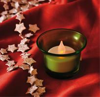 Áttetszõ zöld üvegpohárban pislákoló LEDes mécses. Hangulatos dísz az ünnepi asztalra.