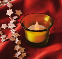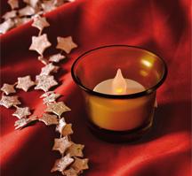 Áttetszõ sárga üvegpohárban pislákoló LEDes mécses. Hangulatos dísz az ünnepi asztalra.