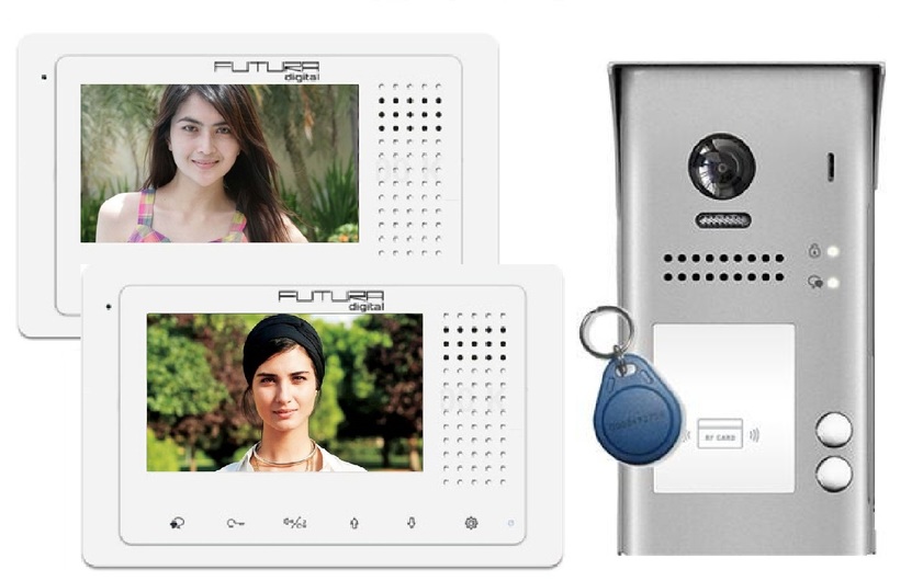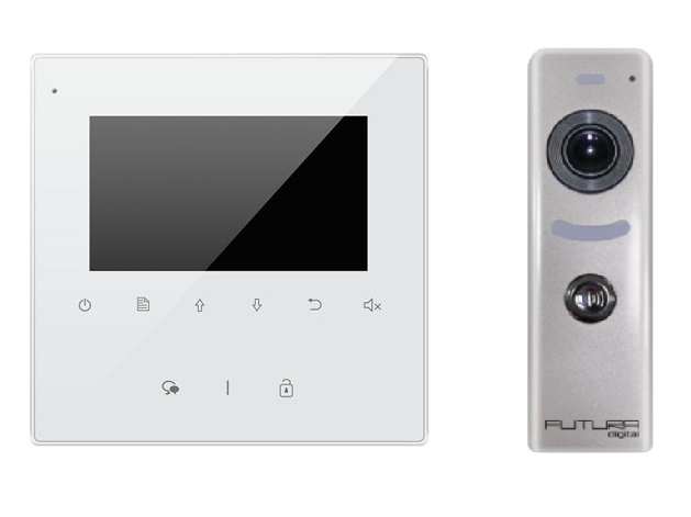 2 vezetékes digitális (BUS rendszerű) érintőgombos (menüs) video kaputelefon szett, kódzáras (mechanikus gombokkal) ellátott kültéri egységgel. Egy lakásban 2 db beltéri egységen fogadhatja a hívásokat.