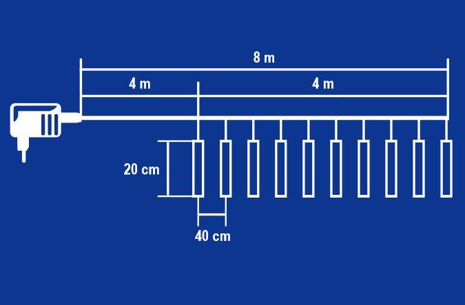A jégcsap olvadást imitáló fényjátékkal ellátott,10 db 20 cm-es átlátszó cső, melyben fehér LED-ek villognak. 4 m.