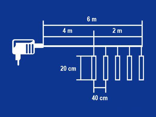 A jégcsap olvadást imitáló fényjátékkal ellátott, 5 db 20 cm-es átlátszó cső, melyben fehér LED-ek villognak. 2 m.