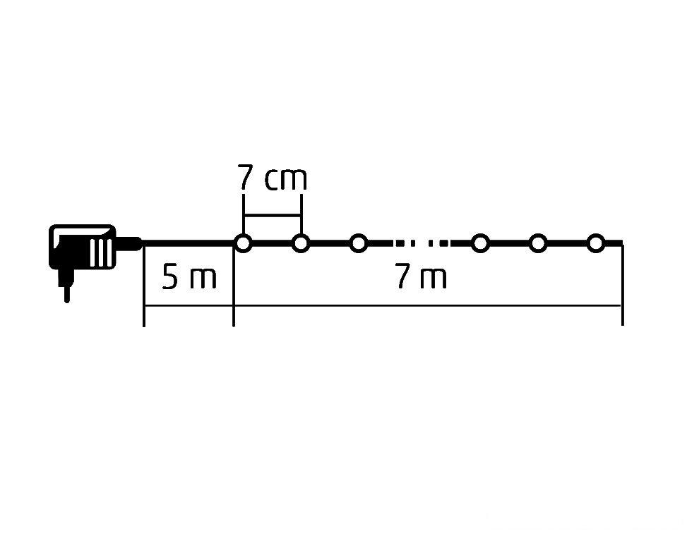 Az egymástól 7 cm-re elhelyezett LEDek 7 m hosszú füzért alkotnak, + 5 m kábel az adapterig.