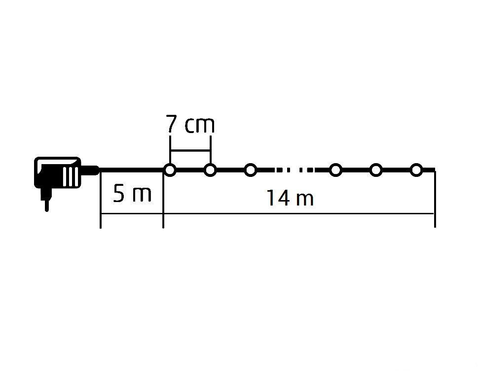 Az egymástól 7 cm-re elhelyezett LEDek 14 m hosszú füzért alkotnak, + 5 m kábel az adapterig.