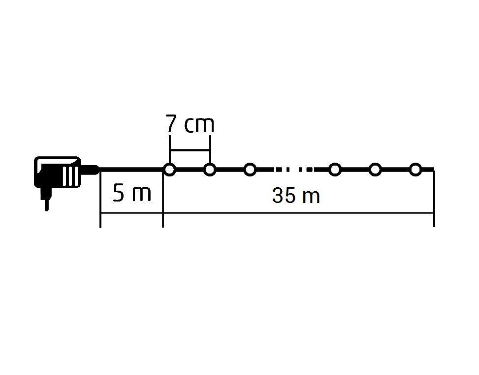 Az egymástól 7 cm-re elhelyezett LEDek 35 m hosszú füzért alkotnak, + 5 m kábel az adapterig.