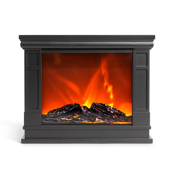 Nagyon-nagyon látványos kis kandalló, amiről nehéz levenni a szemünket. Az *izzó fahasábok felett folyamatosan lángok lobognak és áramlik felfelé a füst*.